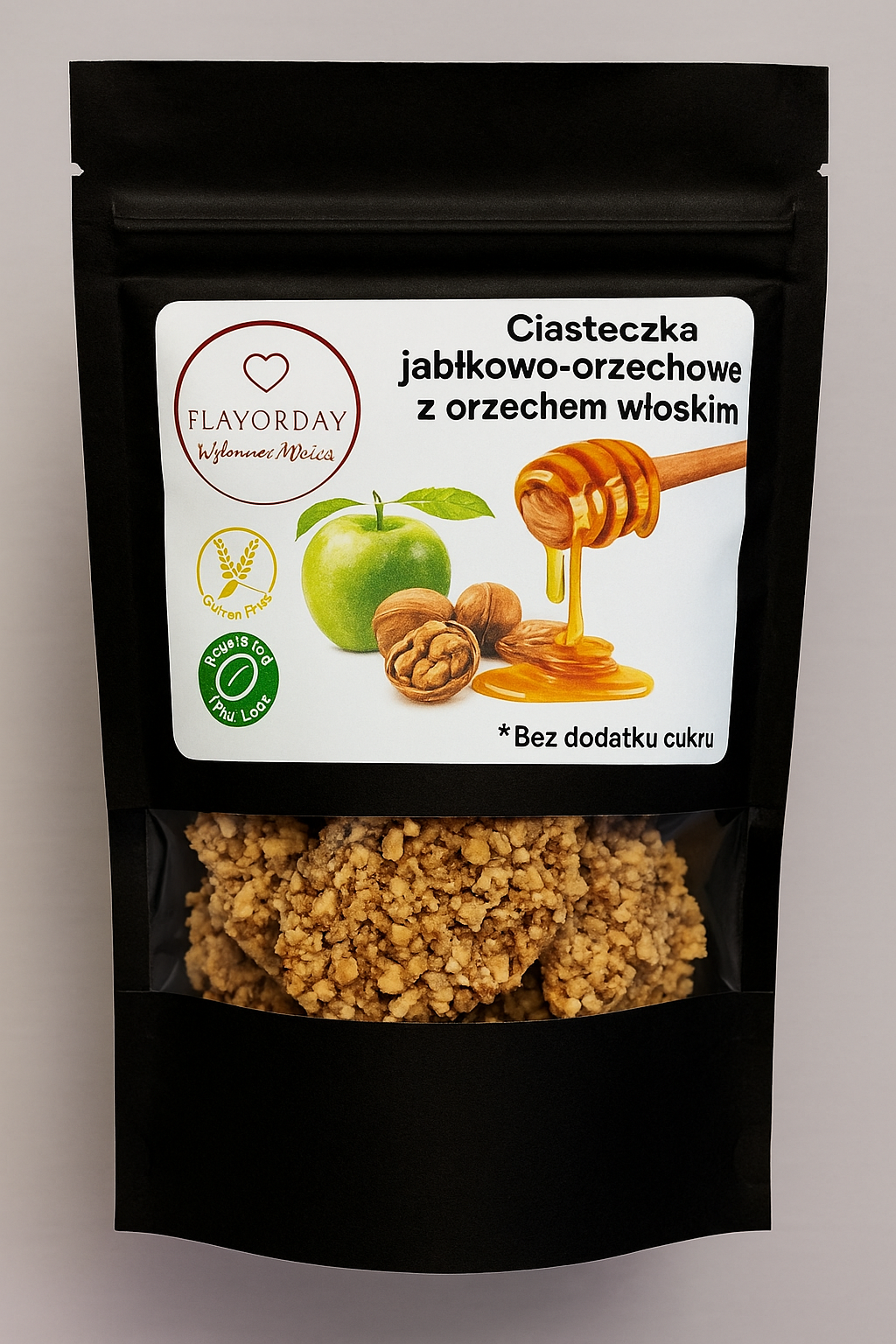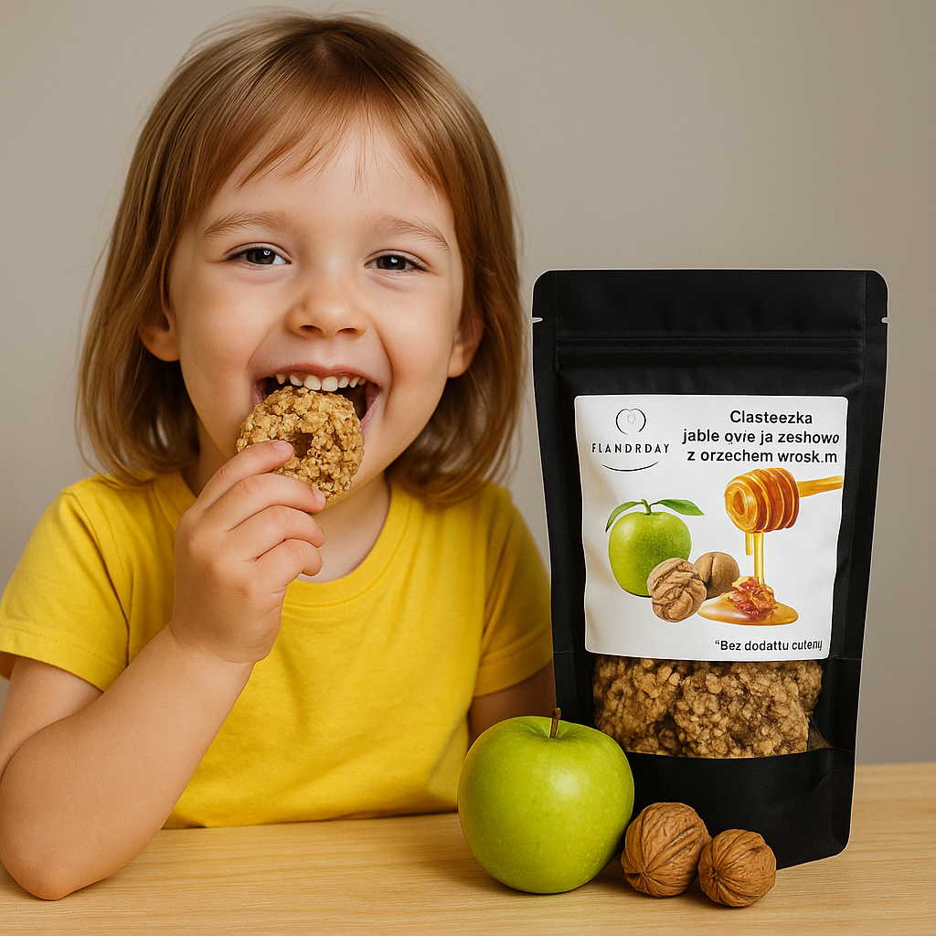„Ciasteczka jabłkowe z orzechem włoskim FlavorDay – zdrowa przekąska bez cukru, glutenu i sztucznych dodatków. Naturalne jabłka, chrupiące orzechy i odrobina miodu tworzą wyjątkowy smak idealny do kawy, szkoły i pracy.”