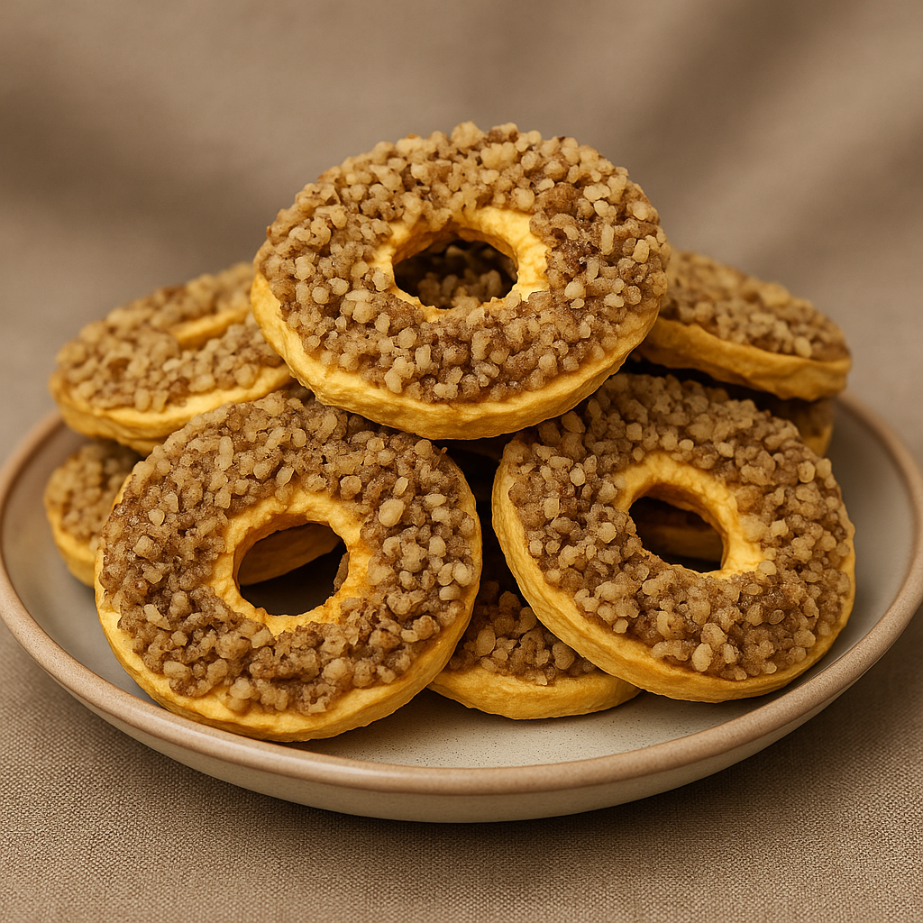Ciasteczka mają wyjątkową teksturę: miękkość suszonych jabłek łączy się z chrupkością orzechów włoskich i delikatną nutą miodu. Każdy kęs to harmonijne połączenie słodyczy i naturalnego aromatu – zdrowa alternatywa dla klasycznych słodyczy.