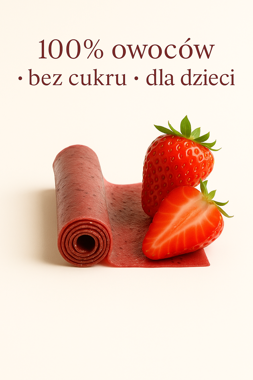 To cienko rozwałkowane i delikatnie suszone paski owoców – bez dodatku cukru, sztucznych barwników, konserwantów ani aromatów. Nasze rollsy powstają z lokalnych truskawek i jabłek, które są dokładnie myte, miksowane i suszone w niskiej temperaturze, aby zachować witaminy, błonnik i naturalny smak. Efekt? Owocowa przekąska, którą możesz jeść codziennie, bez wyrzutów sumienia.